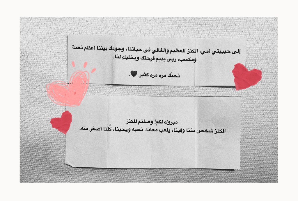 خلال رحلة كتابتي لهذه التدوينة، وبينما أجلس مع أمي في إنتفاضة الجرد السنوي، مررت لي بطاقتان وهي تتبسّم بحب “لا زلت أحتفظ فيها، تتذكري؟”، فتحت الأوراق بنسيان تام وما إن قرأت فحواها ضحكت بصدمة لاحتفاظها بأوراق إحدى مسابقات عيد ١٤٤١هـ. أتذكرها من أبسط المسابقات وأعظمها أثرًا، كانت لعبة البحث عن الكنز ببساطة، ولكن كنزنا الثمين الذي تنافس الجميع لعدة دقائق في معرفته والوصول إليه لعدة دقائق هو: أمي.